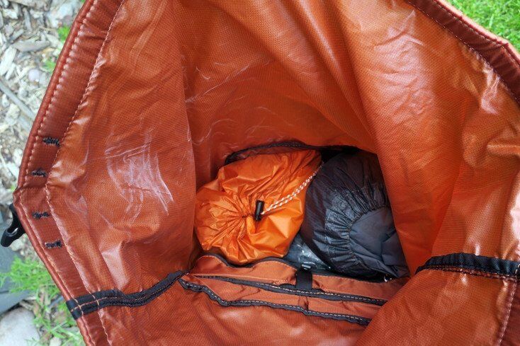 When packing the Granite Gear Crown2 38 Backpack for camping a sleeping bag, tent, and sleeping pad fit vertically inside with lots of leftover room atop the bundle. I hike off-trail a bunch, so putting everything inside the packs works for my needs. However, if you prefer to put a tent on the outside of your pack the Crown2 Backpack has a mesh sleeve in the middle along with attachment points at the bottom.