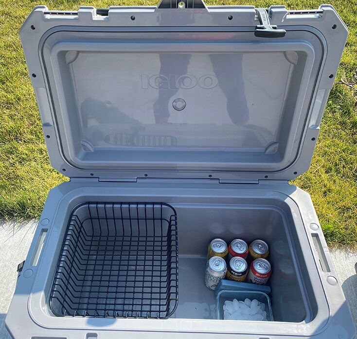 There is an ingenious removable wire basket that holds smaller items or and keeps items out of the melt water. It fits snugly inside the cooler and measures approximately 11”x 12”x 5” deep. It is a very usable size but doesn’t negatively impact the remaining cooler space.