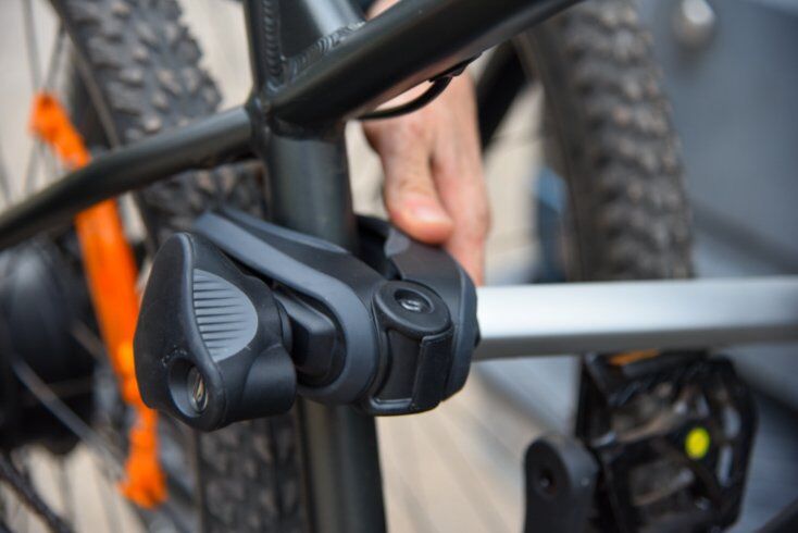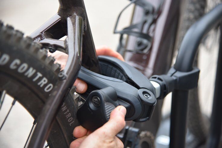 Thule’s EasyFold XT Rack can lock 2 bikes at once. This Thule Bike rack has a set of arms in different lengths that are used to grab onto different mounting points of the bike. Depending on the frame size and style you might find yourself using the arms to attach to the top frame bar, seat post or even the handlebar mount.