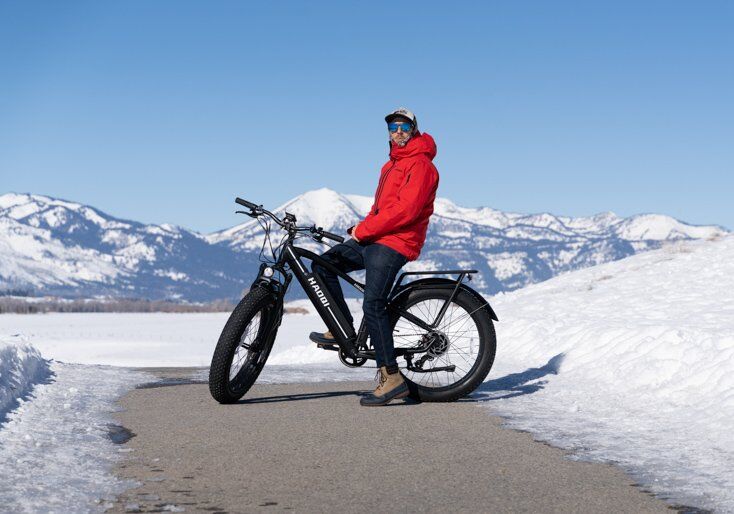The Haoqi Black Leopard is an electric fat bike rated for performance in the snow, but it can also handle tricky conditions like sand and mud. We’ve been testing this snow bike model in the Tetons of Wyoming to see how it holds up in the cold, ice, and snow given its beefy 4” tires and powerful motor. Riding over snow and ice takes confidence, and that’s exactly what you get when you hop on the Haoqi Black Leopard Snow Fat Tire Electric Bike.