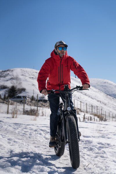 Mike Hardaker Riding on a Snow Packed Trail with the Haoqi Fat Tire E-Bike | Photo Sam Roubin Mountain Weekly News