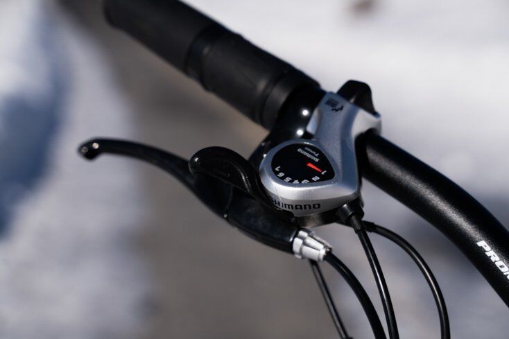 The Shimano 7 speed gear shift gearing provides enough of a range, but expects you to use pedal assist on hills. The Tektro Aries mechanical disc brakes work well but, for a bike that weighs a whopping 72 lbs., I’d like to see the hydraulic option. The alloy pedals offer a secure grip which is useful in snowy and icy conditions.