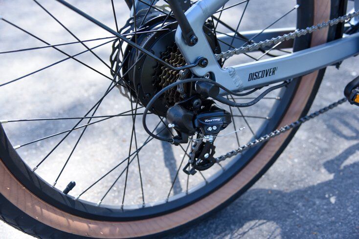 The quality componentry throughout the Discover 1 make it a great deal and reliable ebike for the price. There’s a Shimano Tourney 7-speed drivetrain and strong Tourney mechanical disc brakes to match. The 42t chainring and 170mm aluminum alloy forged cranks are designed by Velotric.