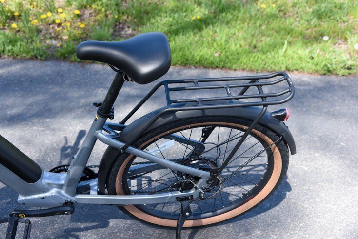 The bike ships with a rear rack and riders can add a front rack if they want. There’s a small, dinky bell on the handlebars that I don’t care for much, but the pre-installed fenders and kickstand add a lot of usability. Comfort runs through this bike’s DNA with ergonomic grips and soft saddle. The seat has a lifting handle which is very convenient when moving or pivoting the bike with assistance from the motor’s walk mode if needed.