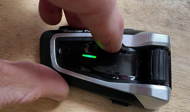 My son and I tried this out on a day at our local hill. To start off, he loved how it looked like he was a soldier, or a pilot, with the small earpiece and the mic reaching into the front of your helmet. Syncing up with your phone is easy enough following the instructions (though you have to make sure your phone’s Bluetooth is available for pairing). The feature I was really excited for, though, was the DMC Intercom Grouping. That took a little practice. First, do do anything you have to make sure that your headsets are charged, using the easy charging port. Then hold the top button down for 5 seconds. It will flash green and black; once synced it turns purple. We did it in our car in the parking lot.