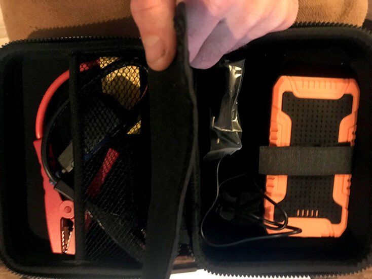 ToughTested’s Jump Starter V8 comes with a nice little carrying case that includes a car charger (because after jumping your battery, you might as well recharge the Jump Starter V8 in case your battery’s bad and you’ll need to start it back up again). Included is the USB cable to recharge the Jump Starter (how can you tell it’s charged? when you push the side on/off button, all 5 indicator lights turn on). And the Ingenious Spark Proof clamps. All in a case small enough to innocuously slide under your seat.