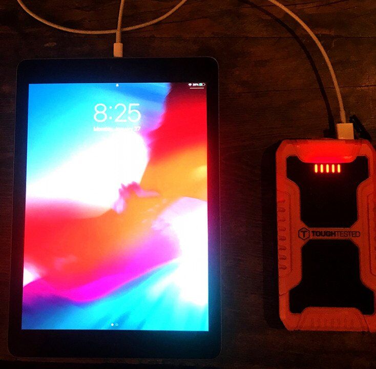 out the window, draw, do mazes, whatever. But sometimes you just need to entertain the kids for a second. If the iPad runs out of juice, especially on a plane without a plug, or in a backseat with no plug easily accessible, you’re SOL. Thing is, you can hook it up to the Jump Starter V8 and keep the party going.