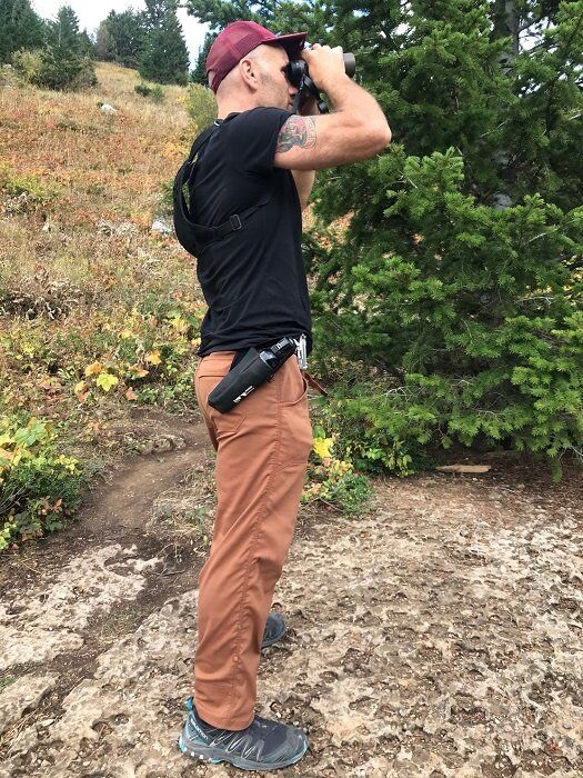 I recently took a Fall hike to the Wind Cave in the Tetons. There was a call for bad weather. But the colors were insane. It started off with my son and I making our way up the trail to the first great vantage point. We took turns staring at the big cave, and then made our way down the cliff to see the other caves along the line, to try and find the other end of it, the Ice Cave. A good test of binoculars I’ve found is if my 7-year-old can figure out how to look through it and see what I’d seen. He was able to pan down and find what I’d been pointing out. I took it up to the cave – again, with the harness it travels easily. In the cave, with water dripping from the entrance, and then below walking through the heavier waterfall I was worried about the lens. Even accidentally drenched it.