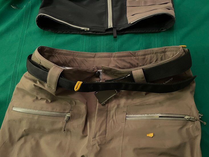 Since these are seriously backcountry specific, though, Flylow’s Compound Bib has a bunch of other details to keep you safe exploring out of bounds. Like a bacon loop inside the thigh pocket since there is a big movement by guides to wear their beacons in a welded pant pocket. Plus other pockets for days – 2 zip hand pockets, 1 rear zip pocket, 1 thigh pocket, and the pocket on that stretchy chest panel. Though here’s the real innovation – you can unzip the bib component and wear these as pants (especially great for those backcountry rest stops), using the built-in belt loops to, well, wear a belt.