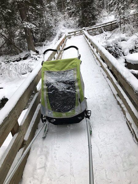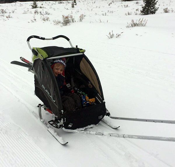 Yeah, dragging the little kid everywhere is fun but Burley’s We! Ski kit has more to it. For long tours, say down the park cross country trail to some more northerly peaks, you’ve got a perfect pulk setup — throw your pack in and start skating. It wouldn’t cruise easily in super steep, tight terrain or deep pow but anything hard, groomed, tamped down — it’ll slide forever. So yeah, when the kids have grown enough to move themselves, your baby tugger is your super nice pulk trailer with high-end shocks and everything.