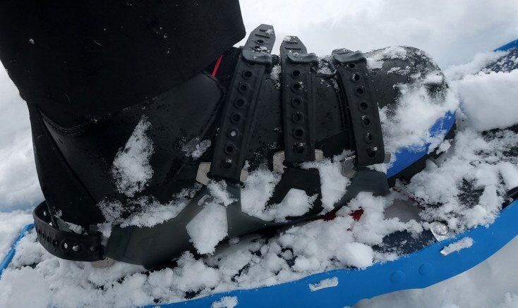 The rubber straps simply lay over your boot, and instead of threading the strap back through a buckle like most snowshoes of the past, you just pull until tight and then fold the remaining part of the strap back over the top of your boot. MSR calls this technology PosiLock™ AT bindings.