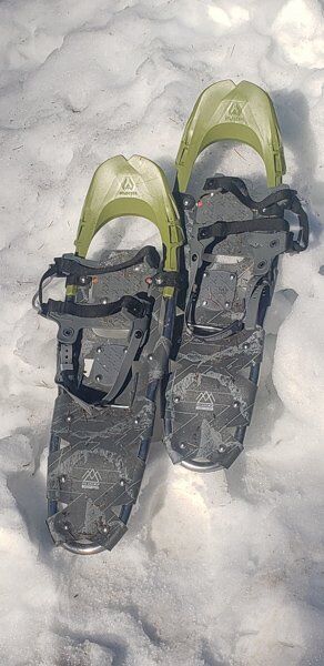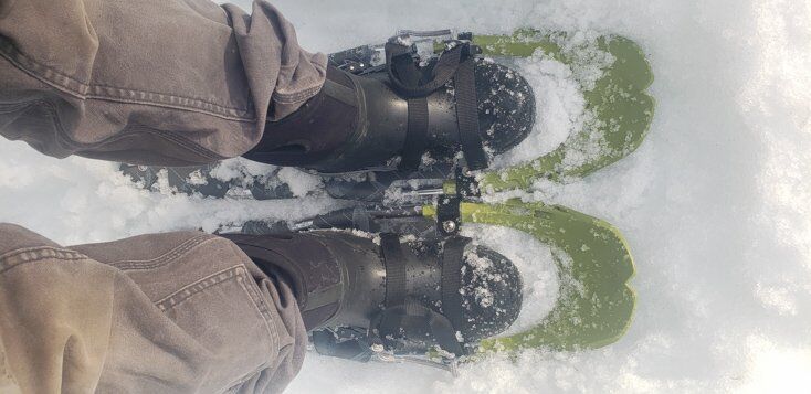 The binding system works very well, but I am impatient (and not very flexible) so I find it a bit annoying to take the time to put them on, adjust them properly, and take them off after every hike. Fortunately, I figured out a simple solution: I just keep an old pair of Bogs winter boots mounted to the snowshoes. Now all I have to do is slip my feet into the Bogs, give the front straps a quick tug to snug them up nice and tight, and I am on my way.