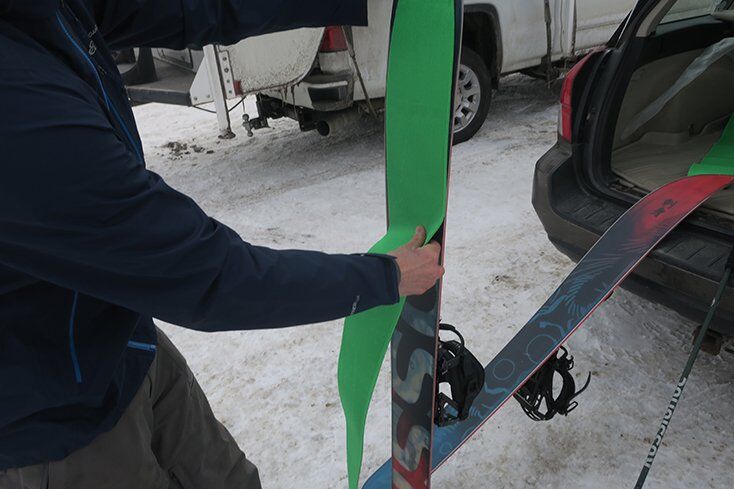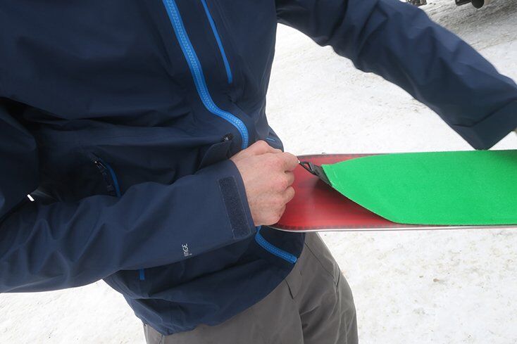 Rossignol once again teamed up with POMOCA for perfect cut Sashimi Splitboard Skins. The board has notches cut out in the tail that are designed to work specifically with POMOCA skins. POMOCA has a bungee style attachment that easily locks your skins into place without any fuss.